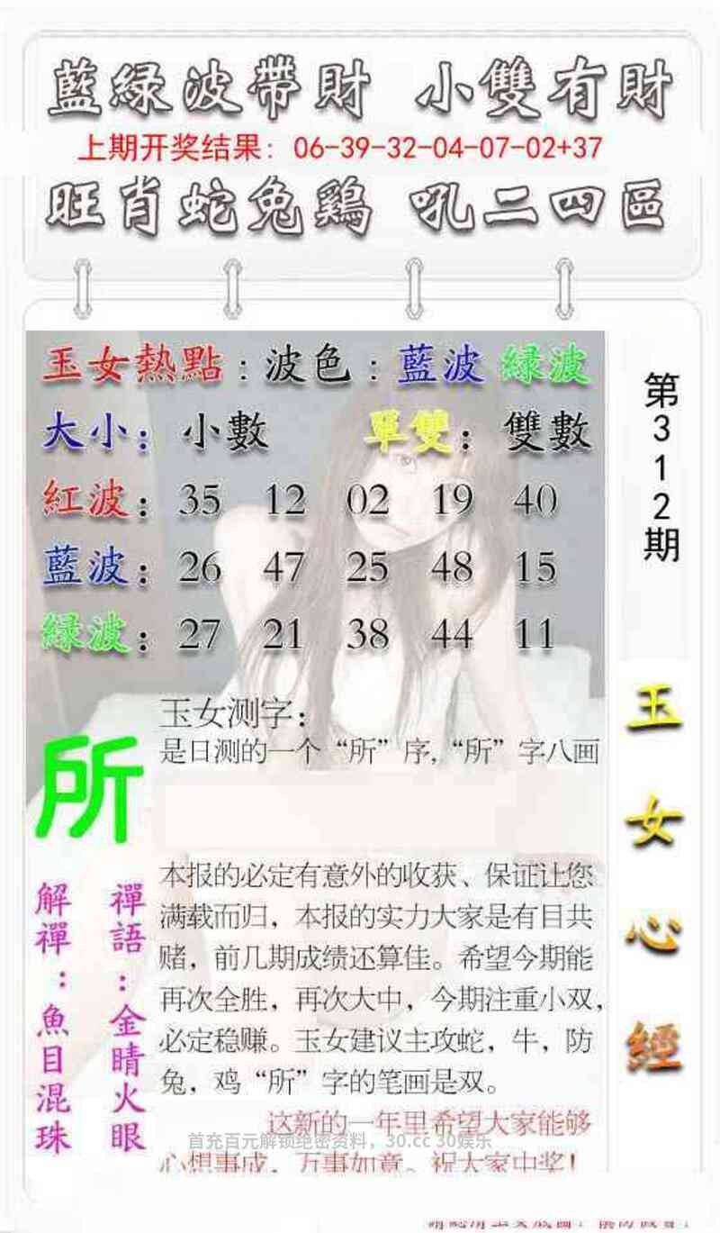 311期澳门彩票中心开蛇37 波色:绿波蓝波 头数:234头 尾数:8463729尾 生肖:蛇龙马猪兔羊鸡狗猴 平特:蛇蛇蛇 主码:37,49,26,38,24,36 防码:31,39,35,33,44,34 |